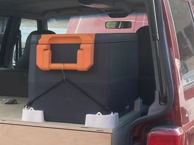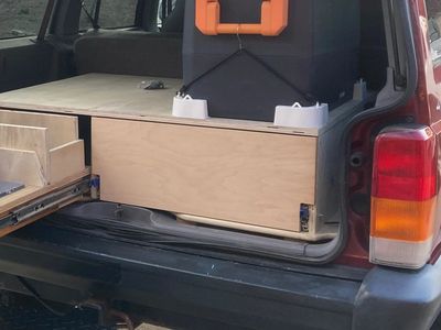My original design incorporated a cooler, much like Blake Weber's build. I had purchased some cooler keepers at the Coleman store when they were going out of business and was trying to incorporate them into the build too. I abandoned the cooler in the drawer idea early on in the build and moved it to the top of the drawer system to use these keepers. The deal was inked in pen when I found this 12v refrigerator on Amazon for under $250. I had added it to my wish list at full price, and lucked out on a flash sale and picked it up for $160! I originally purchased the 20L, but found that it wasn't big enough and second, the lid opened like a regular cooler, hinged on the long side. This 30L size was cheaper because of the flash sale and was hinged on the short side. This worked better for my design, as I now could easily open it from the back and moved my cooler sideways, conserving what little space I had to work with. My Dad got the 20L from me to put in his pop-up camper. Both are bluetooth controllable, so I can set the temp anywhere from -4 to 58 degrees F from my phone, and can also monitor the temp without stopping or shuffling cargo around. This little gem cools down from room temperature to below freezing in about 20 minutes in my testing. A 12v DC cord and an AC cord are both included, however it is important to note that the voltage MUST measure at least 14.1v DC in order for the compressor to work. Some vehicles don't produce that high of a voltage, and our 25 year old Jeep is one of them. I ended up using the AC adapter with an inverter in the Jeep to get the consistent voltage. With my setup, it only consumes 45 watts AC, only operates when the engine is running, and the unit turns off when the key is off. This is both to keep my battery from running down, and because we don't keep perishable items in this fridge. I suppose we could put frozen things in it and they would keep for a while, but we mostly use Mountain House freeze dried meals for camping these days. It does work very well for trips to the grocery store though....