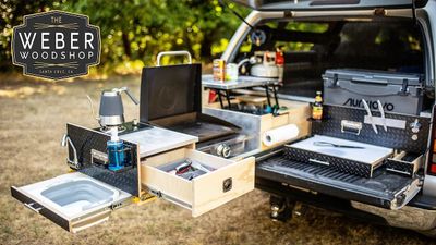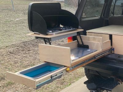 OK, a stove. I had seen the Weber design and he had a sink, a single burner, stove, a 17" Blackstone griddle, and a storage area. That was pretty cool, but I wasn't dealing with the vast length he had available in his pickup bed. I only had 34" depth to work with at the deepest point, and although I had the width, I decided that I would combine the best of his design and incorporate some new ideas. I thought that instead of using the coffee table hinges for a lid to the storage box, I'd use the hinges to get the stove up and to the side of the box. That would clear up more usable space underneath. I had first designated the space under the stove for the sink, but later deemed it as simply counter space, and that would allow me to prep whatever I was prepping just below the stove. In theory, it seemed to work. Now, for the sink, I would extend the sink from underneath that space to the rear, just like the Weber design, with a twist literally and figuratively. Literally because by turning the sink 90 degrees it would now fit in a 16" wide drawer opening. Figuratively because when my sink is fully extended, it only protrudes out about 18 or so inches. Behind that is another 22" x 16" and 2.5" tall unused space that doesn't extend out. I will most likely put some inverse iteration of the coffee table hinge idea that I used on the stove, and use it on the bottom for storage. I'm mostly undecided at this point, but leaning towards this basket, a folding a paper towel holder, or anything that can utilize that space effectively.